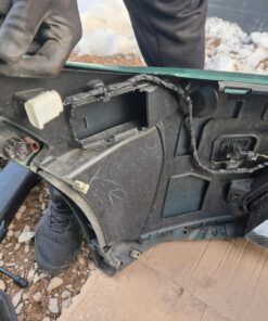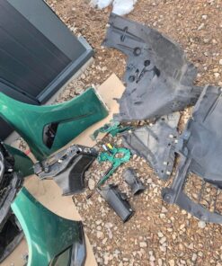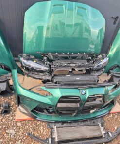 This is the complete front assembly from a single BMW M4 Competition G82 in Isle of Man Green (C4G). The set is the maximum original spec — everything needed for a factory-correct front swap is included. The M4 front bumper comes with the Carbon Package (kidneys, grilles, camera, sensors, wiring harness), the matched fenders include Competition trims, and both Laser Light Shadowline headlights are supplied complete with all modules and control units. The full radiator package, fans, lock carrier and front wall are included, plus hood hinges, actuators for the active hood, wheel-arch shells and the many covers and small parts usually missing from partial sets. All parts were removed together so paint and fitment are uniform — install-ready with minimal work.